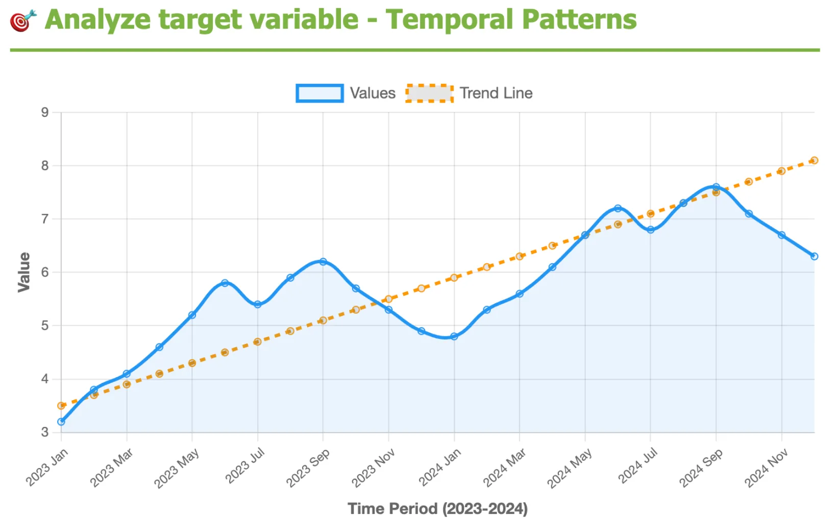 分析目标变量的时间模式: 检查趋势或季节性,因为忽略时间模式可能会导致模型在训练中看起来准确,但在生产中中断。