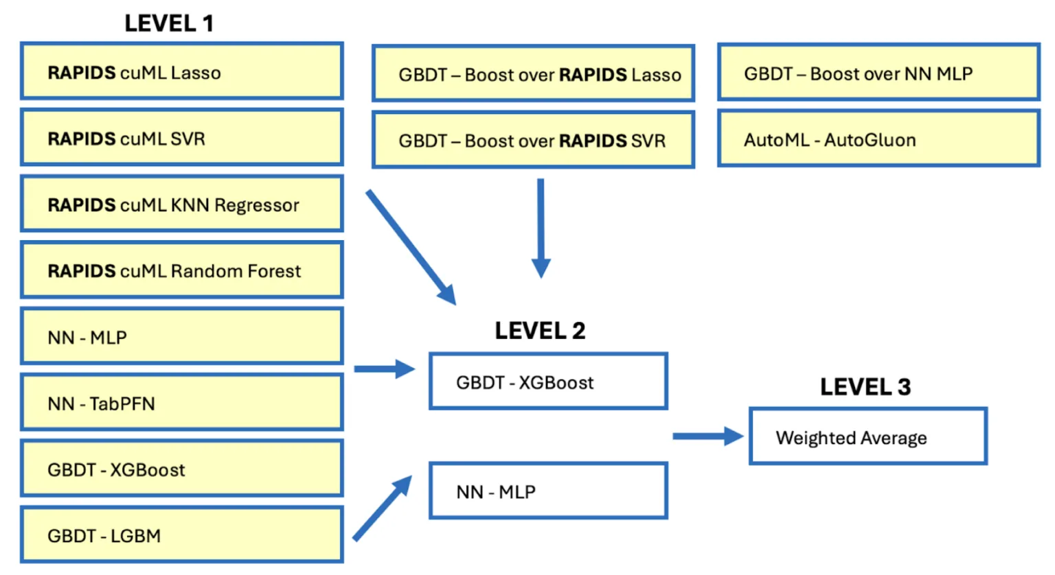 这本剧本经过实战考验,是经过多年的比赛和无数实验锻造而成的。它基于两个原则——快速实验和仔细验证——我们把这些原则应用于每个项目。借助 GPU 加速,这些先进技术变得大规模实用,使其对于现实世界的表格问题和攀登排行榜同样有效。