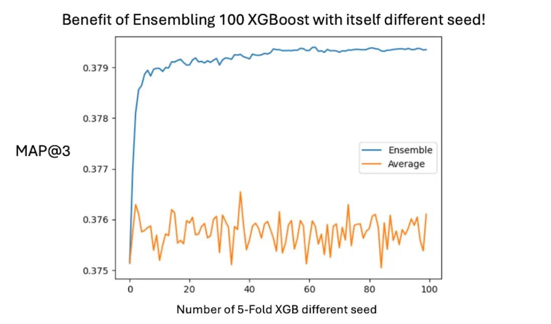 在行动中: 在预测最佳肥料挑战中,对 100 种不同种子进行集成 XGBoost 模型明显优于单种子训练。对完整数据集进行重新训练提供了另一个排行榜提升。 阅读全文 >