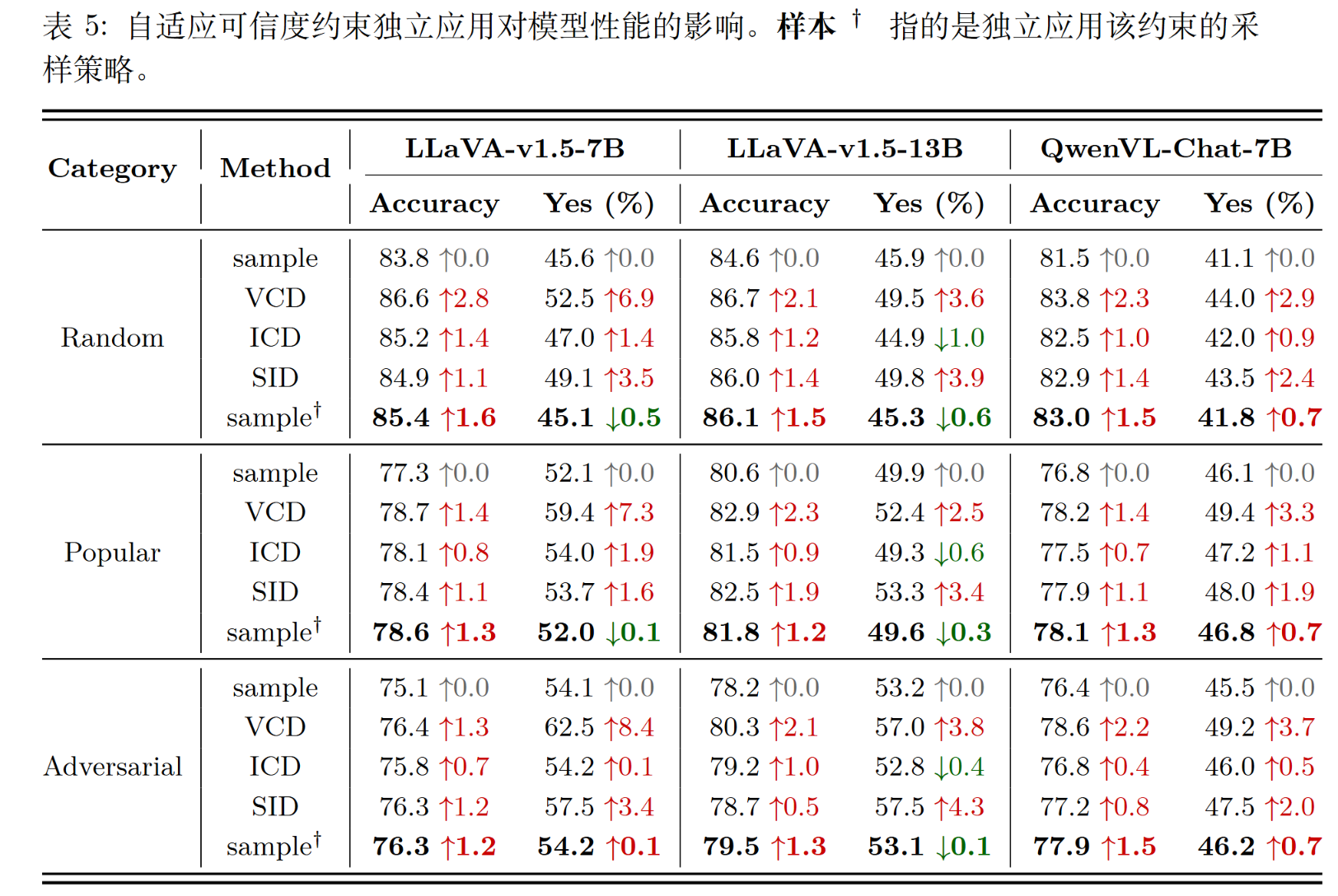而VCD和SID 均显著地将模型输出分布向“Yes”倾斜。