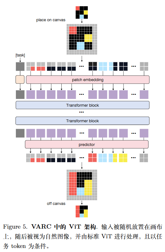 当应用 ViT 模型时,如果将每个原始像素天真地视为一个 token,那么只会存在 C个不同的 token。相比之下,画布支持更大数量的局部、块级配置。例如,当块大小为 2×2时,单个块可以包含多种颜色(如下面的VIT结构图所示),并且在理论上具有指数级大的基数,O(C2×2)。这种公式对于提升泛化性能至关重要。