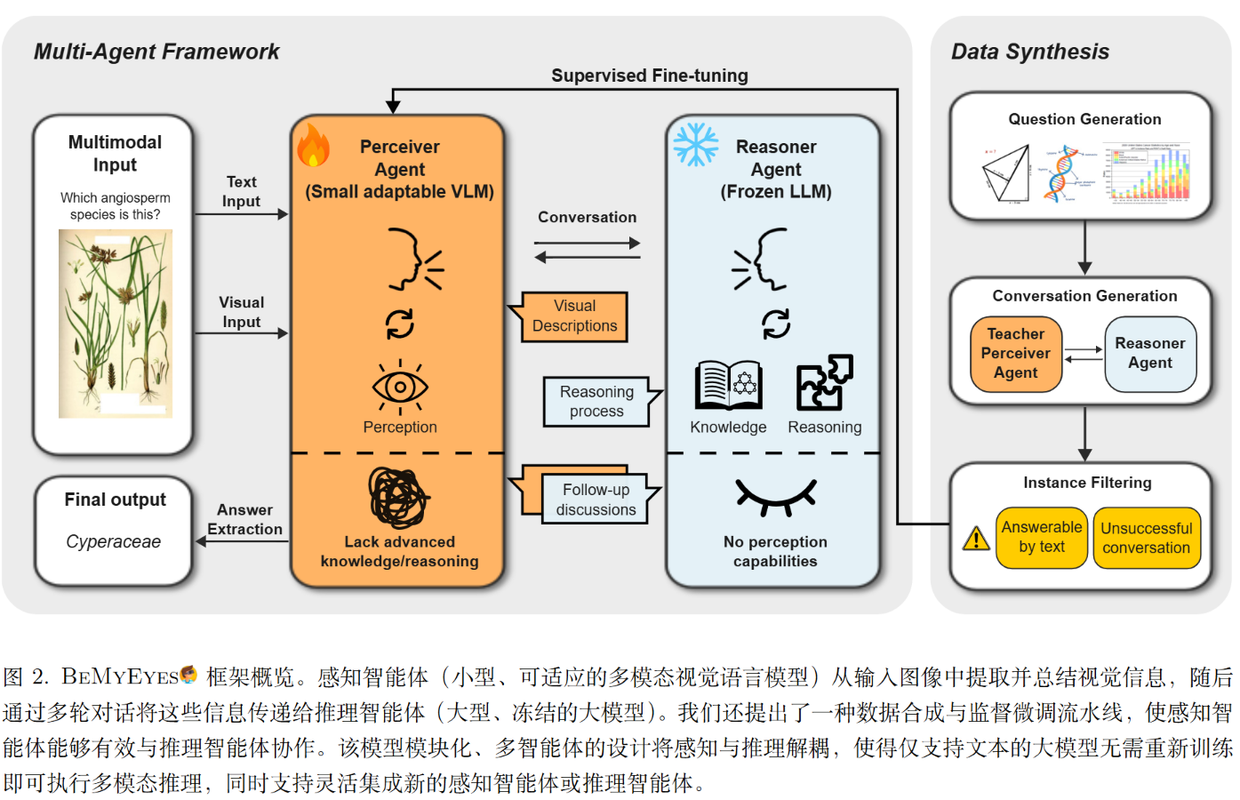 - 特点: 它看不到图像,只能通过文本输入。它被提示(Prompted)去主动向感知者提问,索取解题所需的视觉细节,并根据反馈调整推理 。