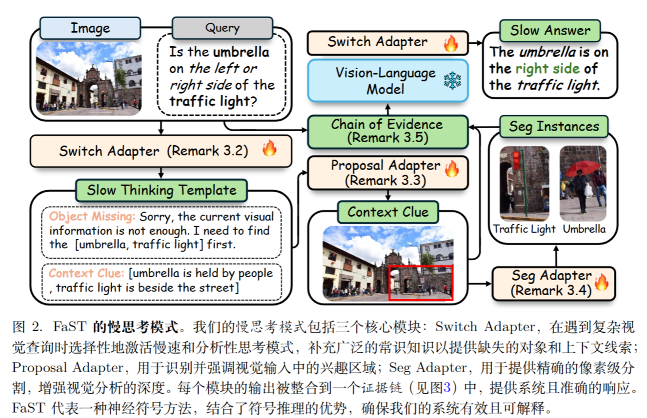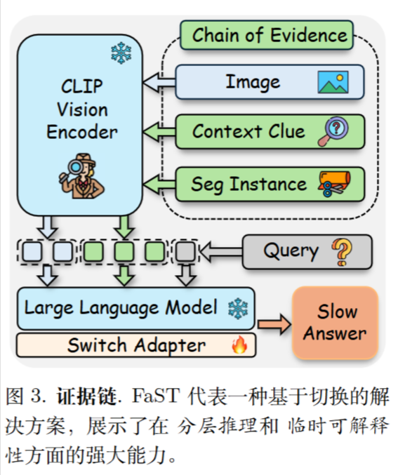 (Chain of Evidence) 证据链类似于大型语言模型中的思维链。但在FaST 中,作者将其定义为基于正确证据的越来越深入的思考步骤。证据链的完成需要许多视觉智能体协作完成。