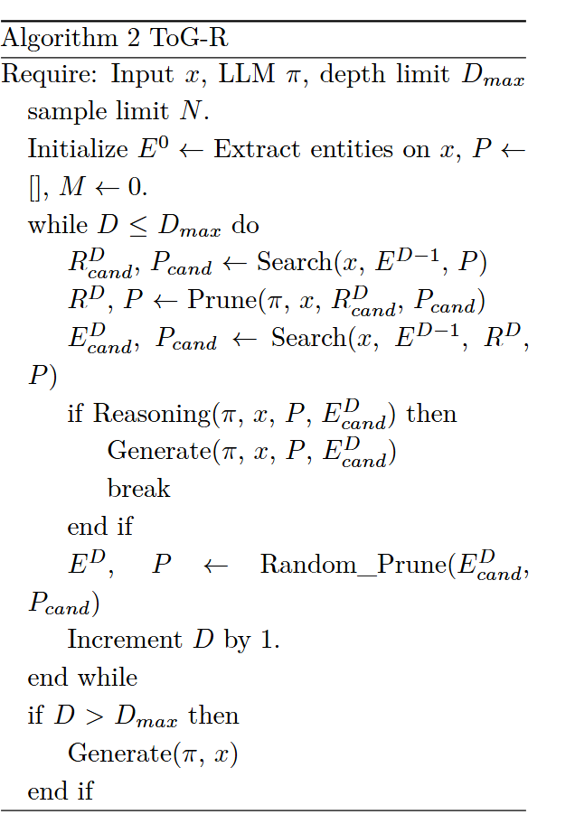 在每次迭代后,LLM 会评估当前收集到的路径信息是否足以回答问题。如果足够,则生成答案;如果不足,则继续下一轮深度的探索,直到达到最大搜索深度 。